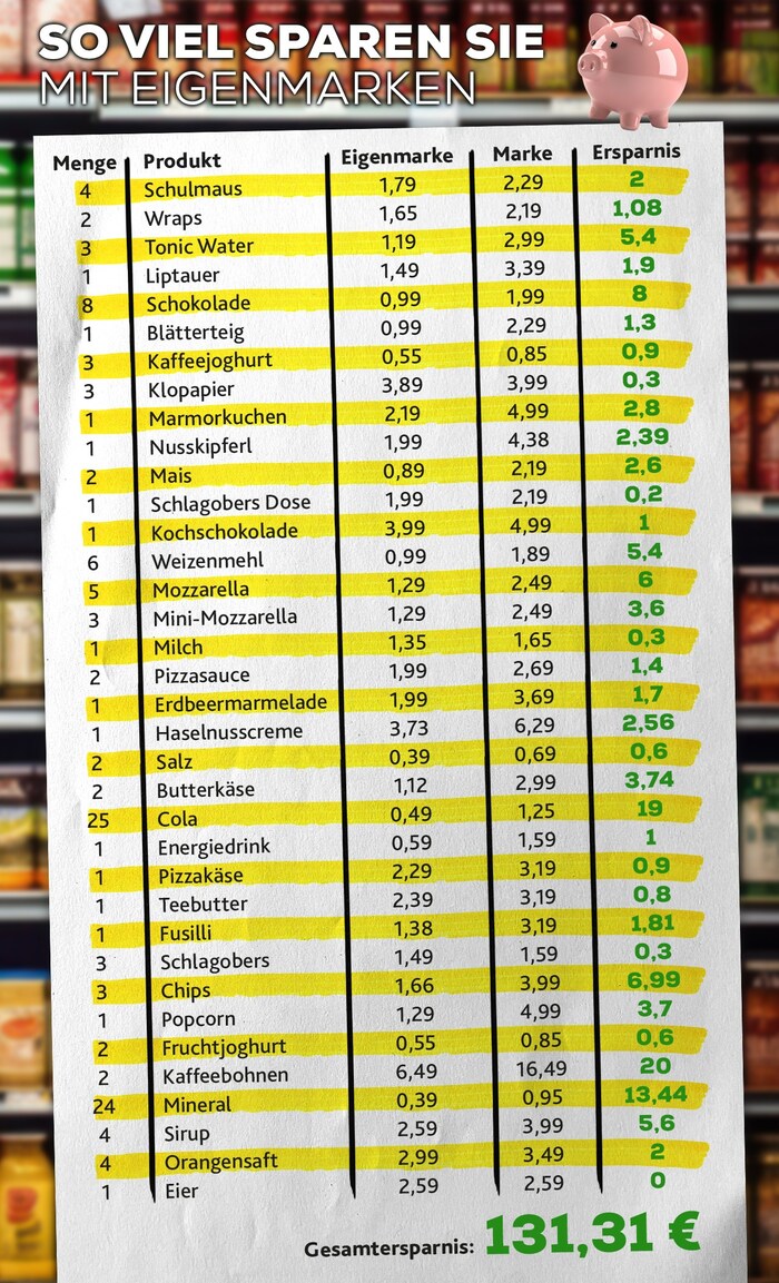 Krone+ провела эксперимент: в течение месяца анализировались расходы семьи из четырёх человек. Всего в корзине оказалось 106 позиций, из которых 36 имели аналоги собственных брендов. Хлеб и выпечка, купленные в пекарне, в расчёт не входили. Результат впечатлил: отказавшись от брендовых товаров, семья смогла сэкономить 131,31 евро. При месячных расходах в 511 евро это ощутимая разница. Самая большая выгода пришлась на кофе, попкорн и чипсы, но и при покупке энергетиков, плавленого сыра или намазки Liptauer экономия заметна.