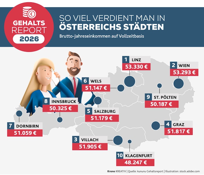 Кто бы мог подумать? Не столица возглавляет рейтинг! Со средним годовым брутто-доходом (при полной занятости) в 53 330 евро Линц занимает первое место среди городов. Совсем рядом, на втором месте, Вена с 53 293 евро — разница минимальна, но она есть.