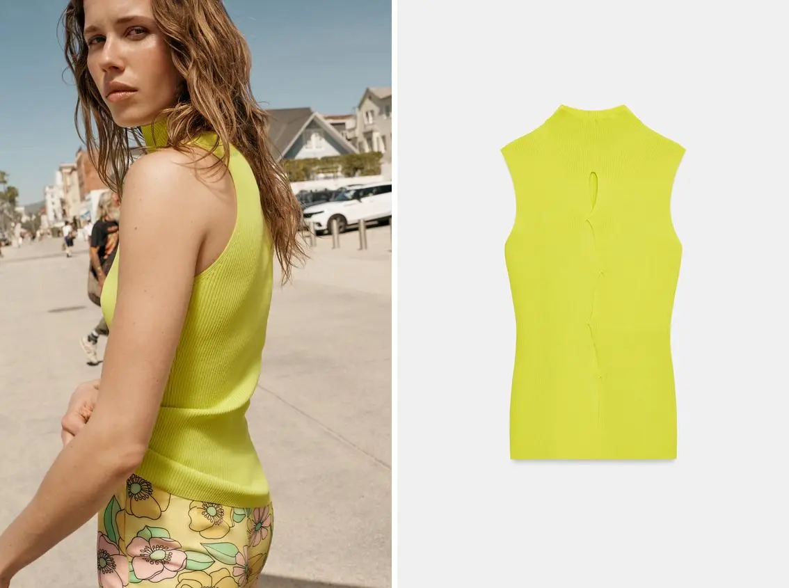 Среди всей флуоресцентной палитры, о которой мы уже упоминали, необходимо выделить один цвет особняком. Это лаймовый - невероятно сочный оттенок зеленого, обладающий самостоятельным характером. Если не отходить от гастрономических ассоциаций, он похож на фисташковый, однако последний чуть более приглушенный, поэтому не стоит ставить его в приоритеты. Лаймовый великолепно смотрится в вещах для лета, таких как платья-комбинации, топы или купальники.